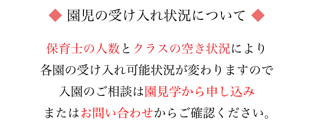 同地域に2つの施設を通じた、地域の『就労支援』と『育児支援』に真剣に取り組んでおり、園児はもちろん、保護者も保育士も、保育に関わる全ての人が笑顔になれる保育園を目指します。